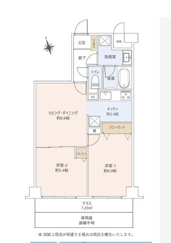 | 間取 | 2LDK (LD8.6帖、K3.4帖、洋室6帖、洋室5.4帖) | ||