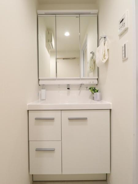 洗面台・洗面所 三面鏡付きの洗面台です。鏡裏にも収納可能。