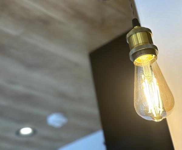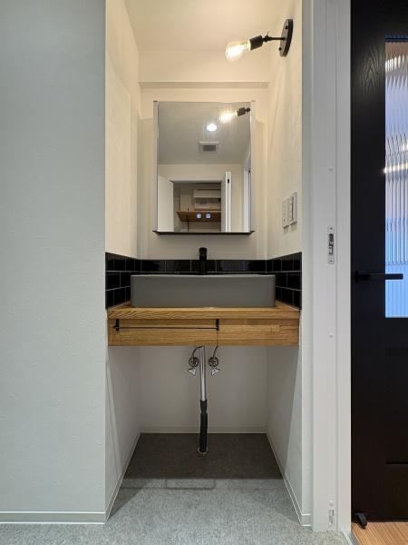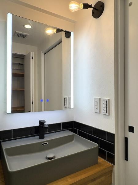 洗面台・洗面所 造作洗面台を温かみのあるエジソンランプが照らします。
