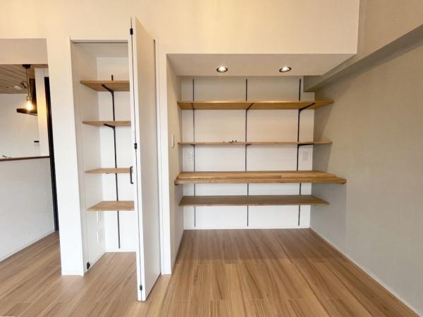 収納 ワークスペースの棚は全て稼動棚になっているので高さを自由に変える事が出来るのも嬉しいポイント