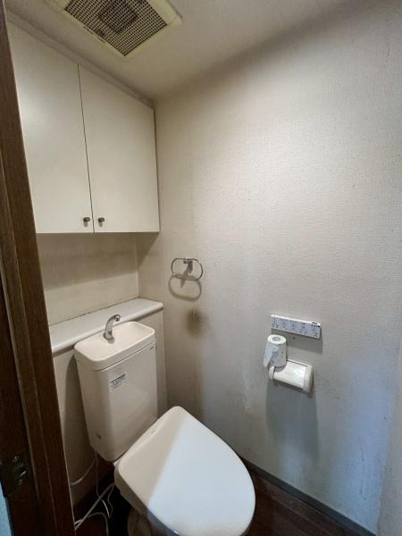トイレ お手洗いは温水洗浄便座です。ストックに便利な収納棚があります。