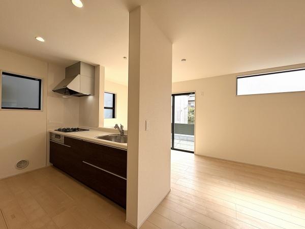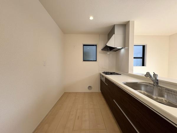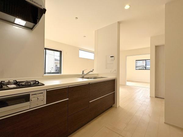 キッチン 家事をしながらコミュニケーションが取れる対面式キッチンは落ち着いた色でまとめられています。