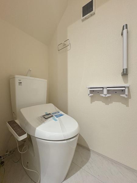 トイレ 立ち上がりに便利な手すり付きのトイレ。温水洗浄便座です。(写真は1階トイレ)