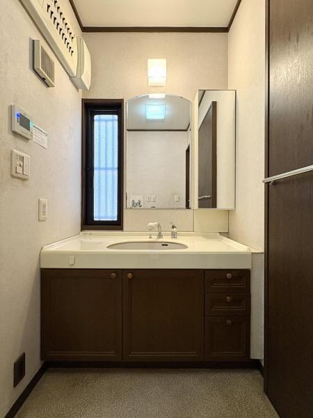 洗面台・洗面所 たっぷり収納できる洗面台。備品をすっきりさせることで生活感が出にくくなります。明るさを取り込む窓付きです。
