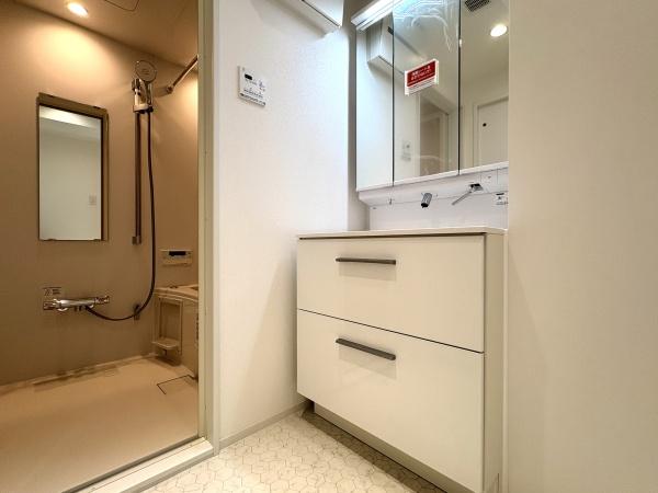 洗面台・洗面所 三面鏡付きの洗面台です。鏡裏にも収納可能。
