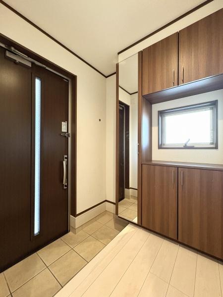 玄関 たっぷりと収納できるシューズボックスを備えた窓のある明るい玄関内。