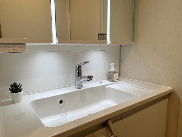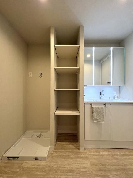 洗面台・洗面所 収納豊富な洗面所。備品をすっきりさせることで生活感が出にくくなります。洗濯機スペースもございます。