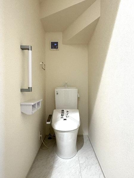 トイレ 立ち上がりに便利な手すり付きのトイレ。温水洗浄便座です。(写真は1階トイレ)