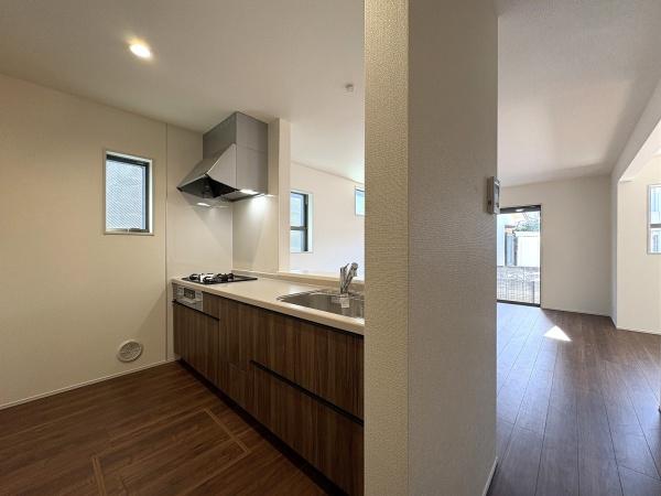 リビング キッチンまで一つにつながる開放感。15.75帖です。
