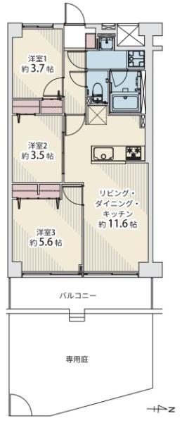 | 間取 | 3LDK (LDK11.6帖、洋室5.6帖、洋室3.7帖、洋室3.5帖) | ||