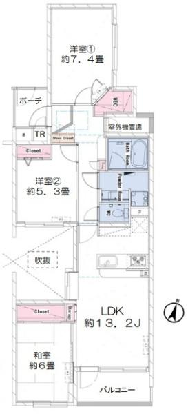 | 間取 | 3LDK (LDK13.2帖、和室6帖、洋室7.4帖、洋室5.3帖) | ||